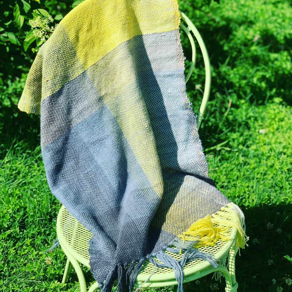 I ran into a little bit of trouble with this one. I used Lion Brand Mandela (cake) yarn in I think Yeti but it was very yellow and blue heavy and light on the tan/white colors. I used most of one cake for the warp and most of a second for the weft on my 32 inch Kromski. It’s about 28 inches wide and just under 60 inches long.