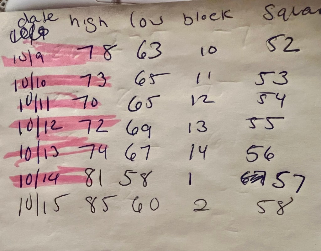I have a notebook too (of course!) where I track the temps and what block I am on and the over all square number.