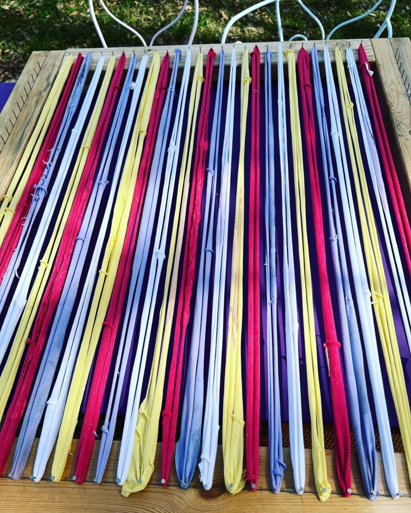 The day after I picked it up was super sunny and nice so I cut up some old t-shirts into loops and got to weaving on the smaller loom. Boy was that a workout! I think if I really get into making these I need to get an easel. I had it flat on our picnic table and it was a lot of bending over. My fitness tracker thought I did a very long exercise routine which I guess I did.