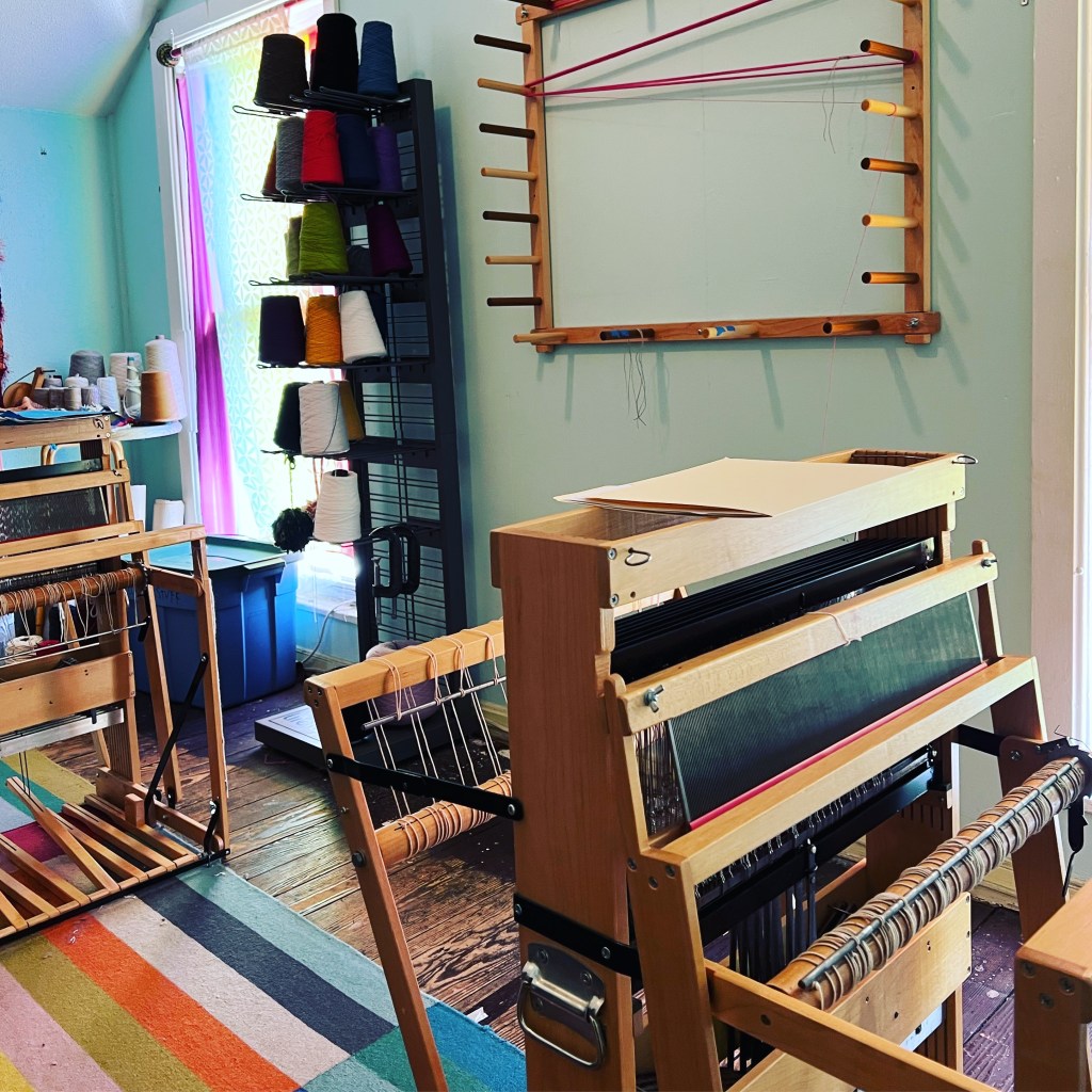 I was checking the hours for a local yarn shop (that doesn’t sell weaving supplies) thinking they might have some yarn to use as weft on my Wolf Pup I just warped (and future warp—with the 8 dent reed I can basically use knitting yarn) and noticed they had weaving classes this weekend!