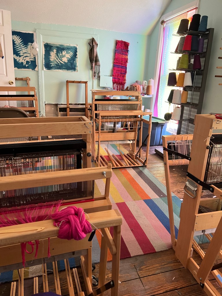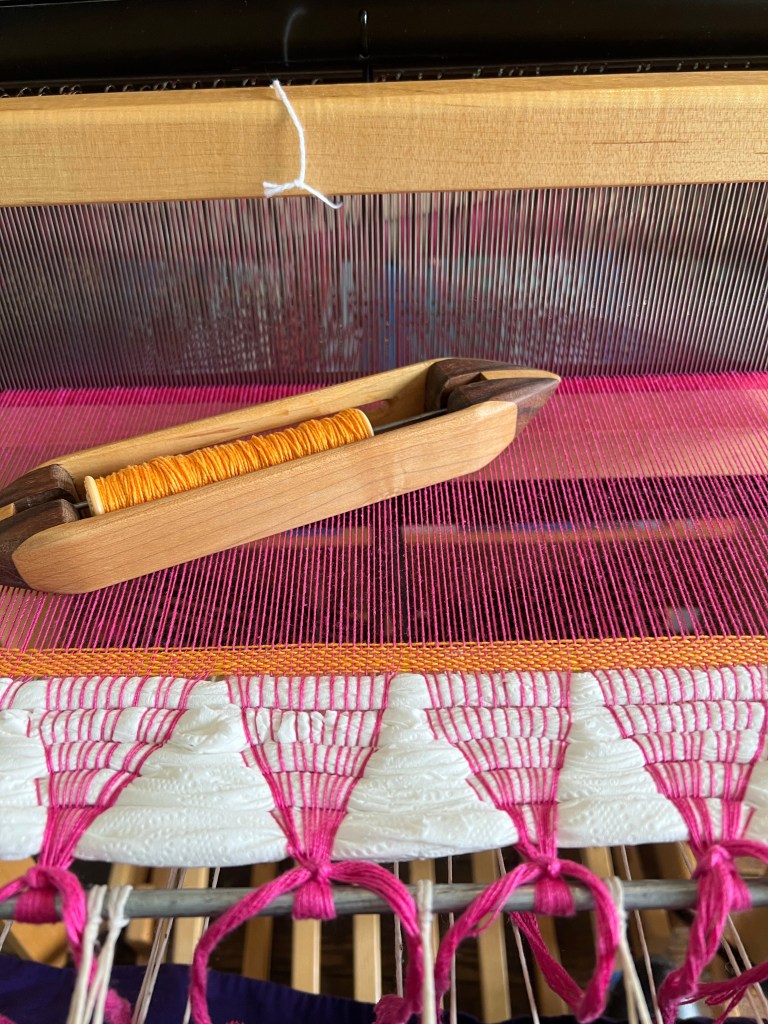The loom is older and kind of banged up and the track(?) the heddles are on were kind of squished together which slowed me down. I’m glad my looms at home are in better shape. I kept grabbing the wrong heddle (it’s an 8-shaft) because the two tracks were curved together in a weird way.