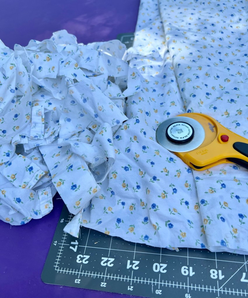 In line with my interest in upcycling, this box is a rag rug. They send you yarn for the warp (I wish it was thicker because we had to double it up) and you use fabric strips for the weft. I bought some flat sheets at the thrift store to use. It was finally cool enough to take them outside and cut them up. You’d be amazed how many particles come out of cutting up so much fabric!
