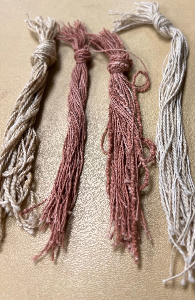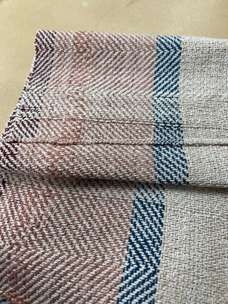 One of the members did a little experiment with using a variety of 4/2 and 8/2 cotton or cottolin, soy milk as the “mordant” with alder cones, rhubarb leaves and avocado skin for color. She dyed the warp with blackberry tea. She also used some commercially dyed yarn for contrasting stripes. I thought it came out really well! I liked the brighter parts because the natural dye is pretty subtle.
