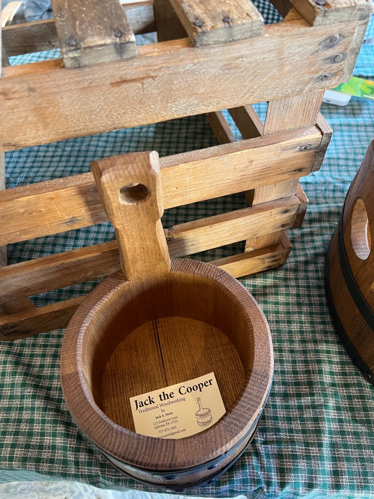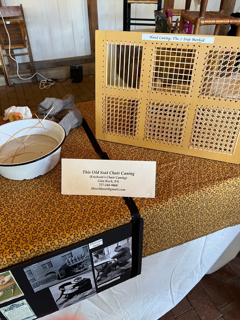 Neither of us were really expecting vendors but there were a lot of niche vendors what sold niche crafts and were showing off their goods. we bought a sassafras bowl/dipper from a cooper (who also teaches coopering at the museum at times!), some wool from a spinner, had a long chat with a woman who canes chairs (my husband now really wants to do this) and a woman who made jewelry out of human and horse hair like Victorian hair work. I think she might be a good speaker for my weaving guild next year! It was very interesting to see the weaving process. There were also farmers with pawpaws and different types of apples, potters and gourd artists. One table was selling tape looms (even fancier than the ones we had bought at the museum before with an extra decorative hole section), pot pie noodle rolling pins (I was tempted) and other wooden handcrafts.