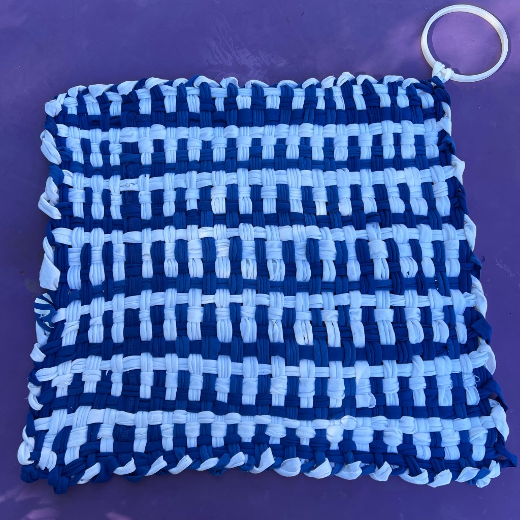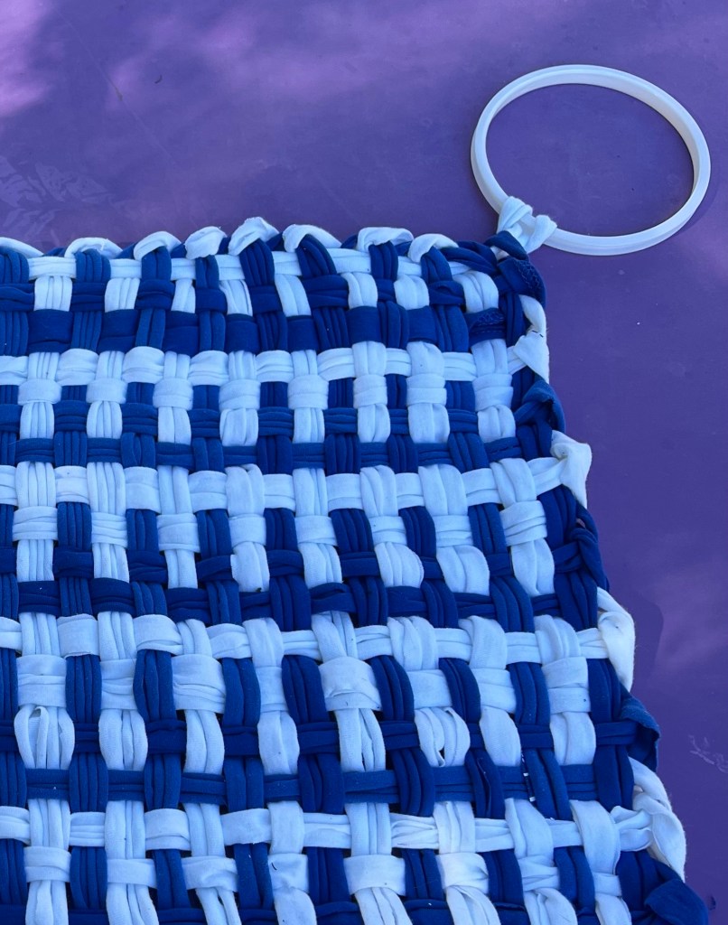 I wove the rug alternating blue and white for the warp and alternating double rows of blue and white for the weft. Then to really make it look like a pot holder, I looped in the inner part of a plastic embroidery hoop like you would with a real pot holder to hang it up.