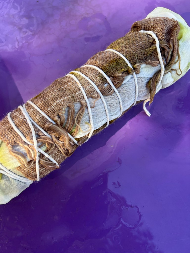 I damped the scarf and the cotton towels again and rolled the leaves into it. I put the “bottom” of the leaves directly on the scarf.
