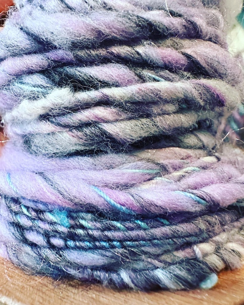 I ended up mostly core spinning but there were some parts that were more plied. I wanted a sort of thick and thin look and since the colors were similar, the core looked good peeking through.
