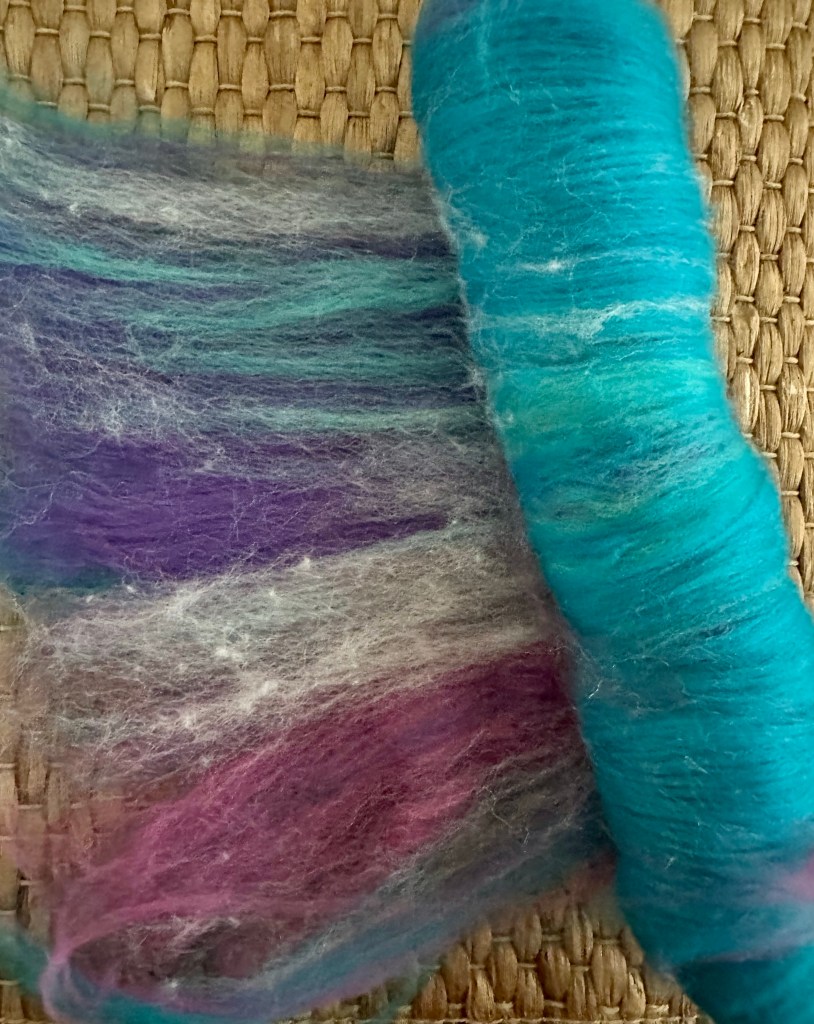 Easy day today! I used my new drum carder to make a batt of some new roving, some roving from Flying Fiber and tiny bit of Starfire from sample pack and sari silk.