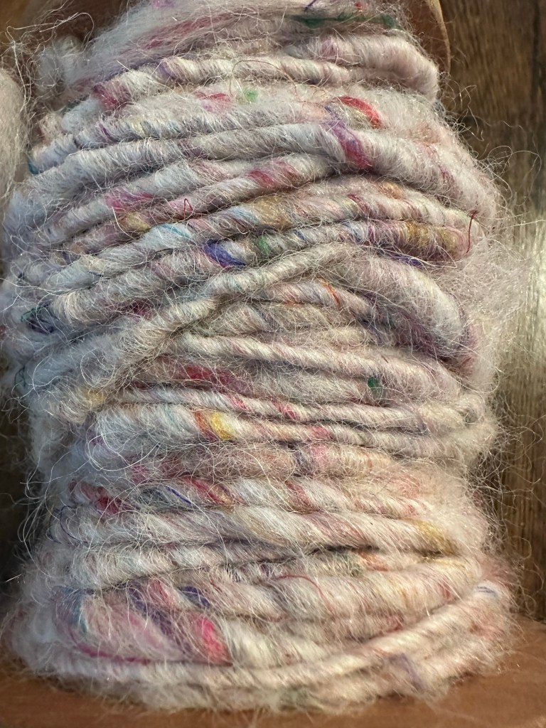 It was so fluffy! I don’t know if I’ve spun alpaca before. It was really fun and quick. I core spun it with some rose colored crochet cotton. I think I’m getting better with core spinning!