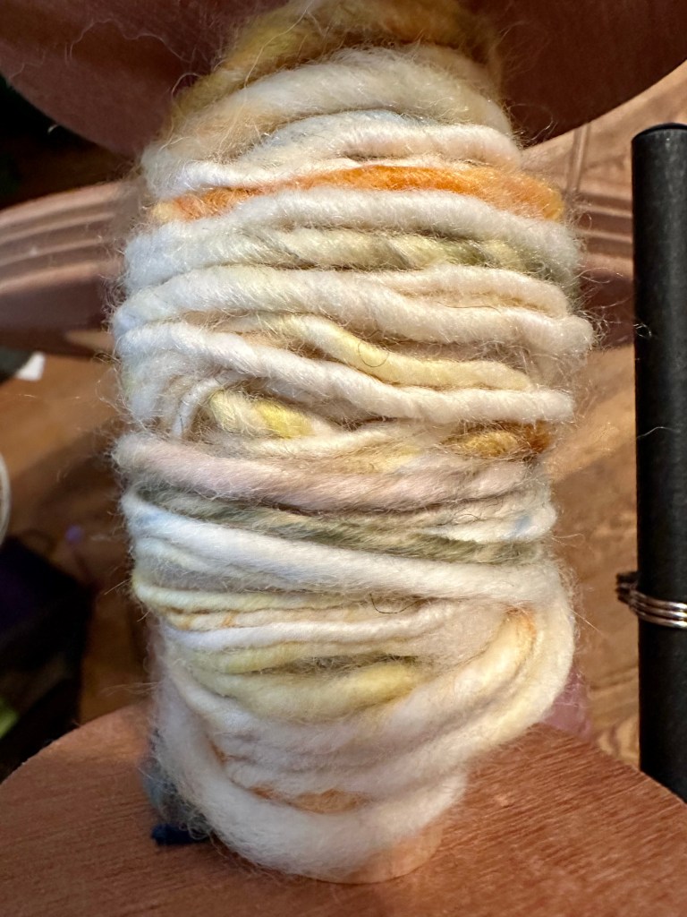 I didn’t like drop spinning but I hung on to the wool. It’s pretty cute! I just did a single ply and might use it as an accent on a weaving.