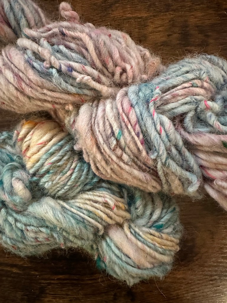 It’s alpaca and sari silk. I spun it all today. I did one thick pink/purple and then two thinner. One with yellow and green and one with the reddish and blue.