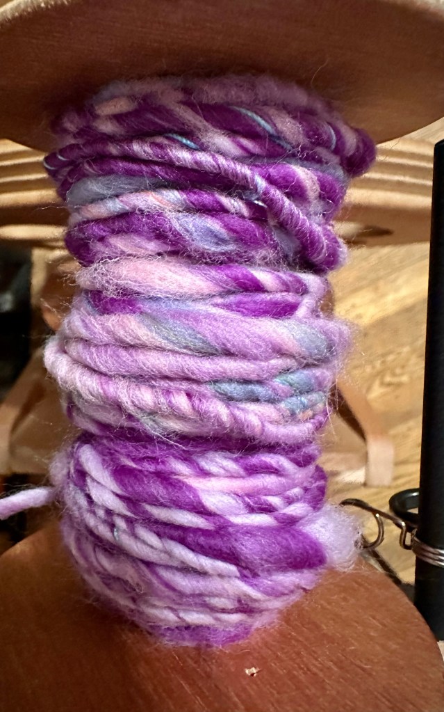 I corespun the batt I made yesterday. I was going for some thick and thin texture which I think I accomplished. It turned out more stripey than I expected. I look forward to trying more batt making and seeing how to manipulate that.