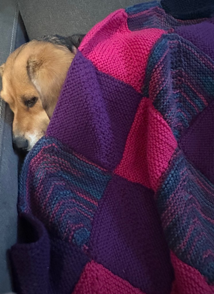 I added his four to each corner of my twelve and added two new squares in the middle. The blanket is longer than it is wide but it covers my lap with some room for our pughuahua Lulu and over my knees which is what I wanted.