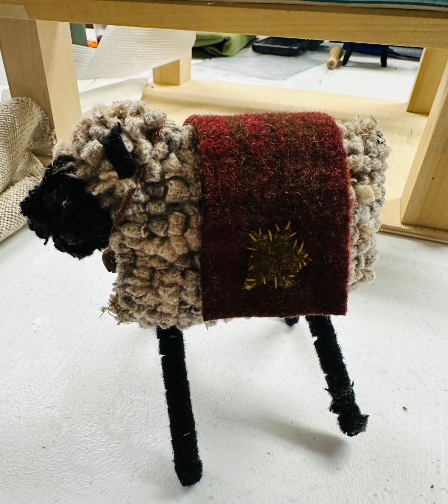 The class was a lot of fun, we made the whole project from hooking the rug, to sewing on the backing, stuffing it and putting on all the details like wrapping the legs in wool and making a little blanket in four hours.
