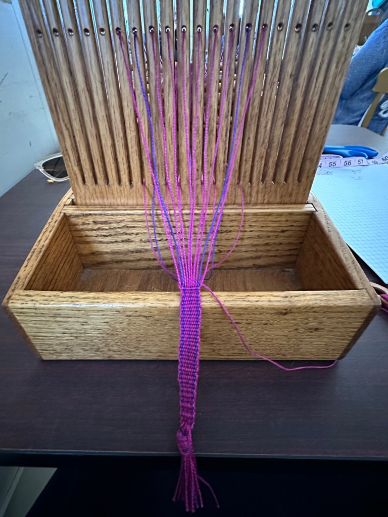 I had bought a tape loom at the museum about 18 months ago and played around on it but didn’t produce the best tape. Susan Weaver came to my guild last year and did a demonstration about how they used to tape in clothing.