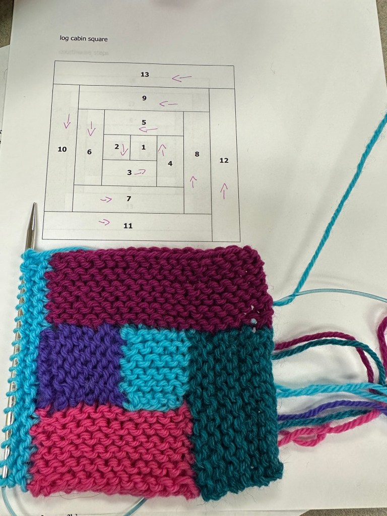 My first class was log cabin knitting. My mom and I made a lot of log cabin quilts when I was kid so it was fun to knit squares! It was pretty easy to do but great to be taught exactly what to do. We really don’t know any knitters so everything is on our own so it’s nice to learn all the tricks and be on the same page right away!