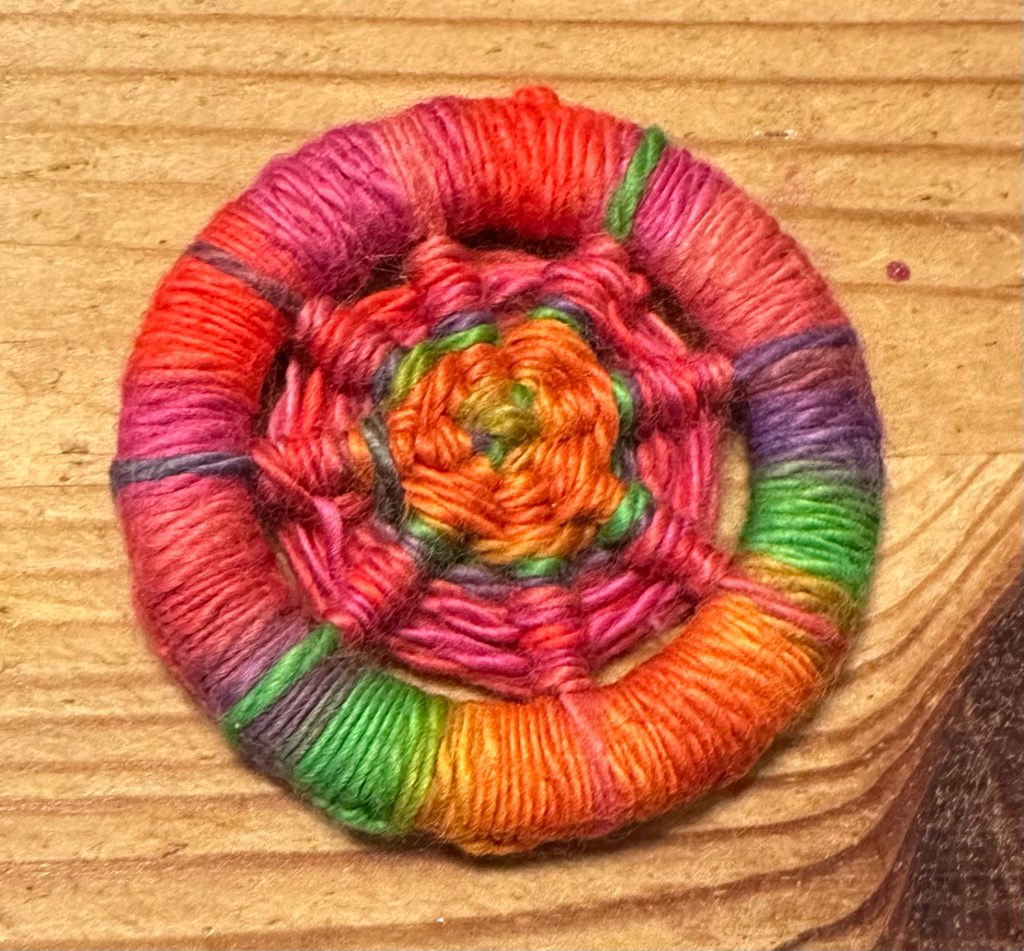 I did manage to make a jumbo button but the kit she provided for $5 didn’t have quite enough yarn so there are gaps. The yarn was also very splitty. I think there are other cotton yarns that would have worked better for beginners but she said she wanted to use up her own scraps.