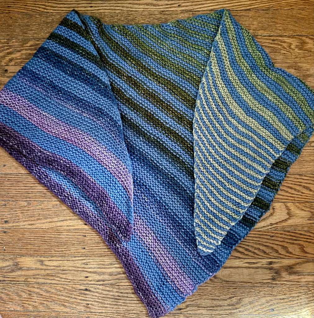 I like how it turned out but learned I should have used the end of the variegated yarn (Dusty Woods) with the color I wanted to see most (purple) first. I thought it might even out since the later stripes are wider and the middle section would be behind your neck but you really see the most of the color you start with.