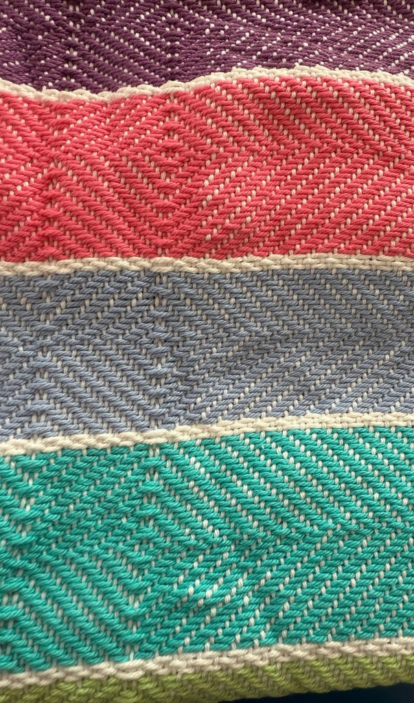 It’s made with a thick cotton yarn (Sirdar Snuggly for the warp and white stripes and Sirdar Happy for the weft) which I found a little tedious to work with because it came on little balls or skeins. I have a couple of the Happy left because I didn’t want to wind it all on bobbins and not use it which I think would work well for crochet.
